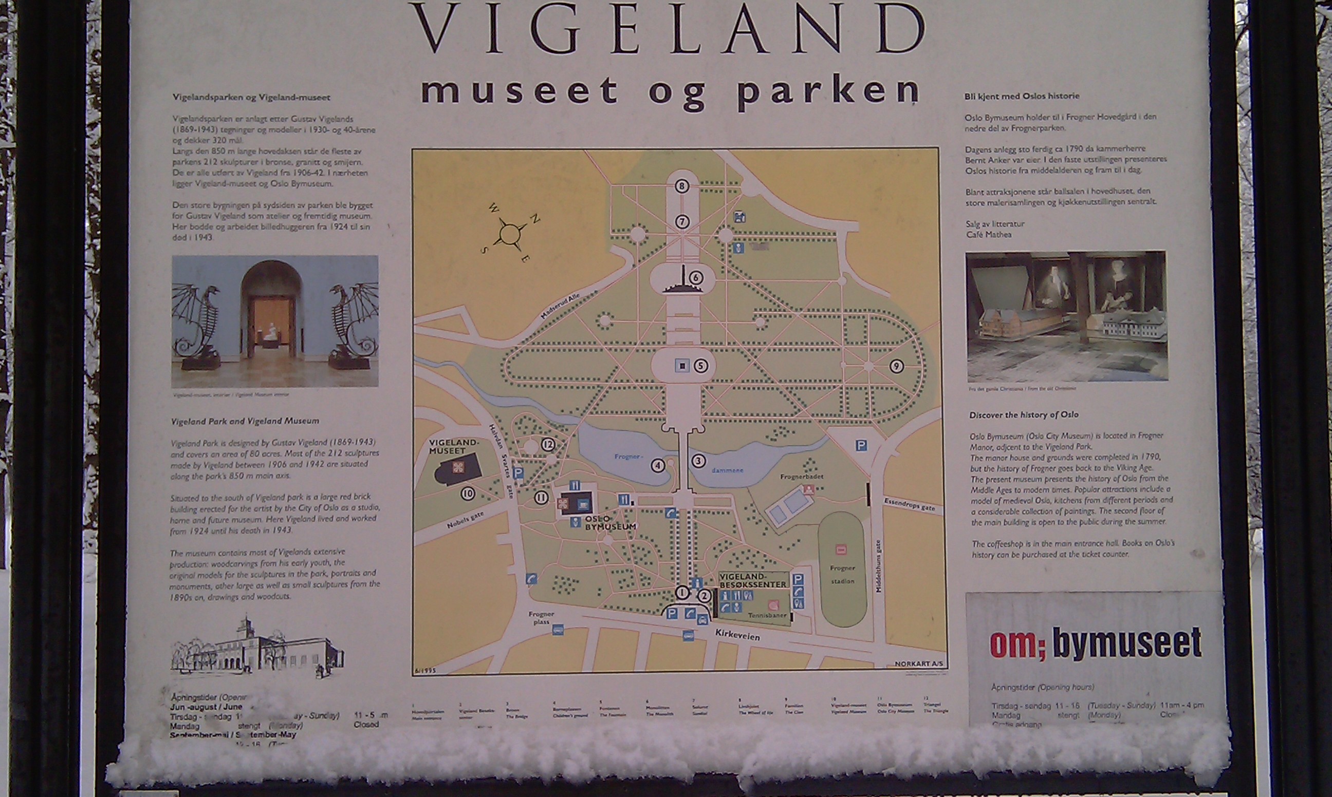 Între hotarele sale găsim VIGELAND-SPARKEN – un copleşitor şi plin de dramatism muzeu în aer liber. Sculptorul norvegian Gustav Vigeland (1869-1943) realizează o frescă a umanităţii şi o alegorică reprezentare a ciclului vieţii. Cele 212 sculpturi imense din granit şi bronz ilustrează diverse ipostaze ale
