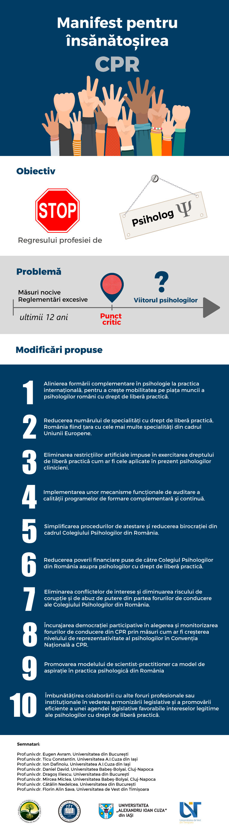 Vă lăsăm pe dumneavoastră să decideți dacă veți dori să sprijiniți demersul nostru, pentru ca împreună să contribuim la reinstalarea democrației și a integrității în CPR. Unul dintre pașii necesari pentru a face din profesia noastră una respectată de către societate și consonantă cu cerințele de formare existente la nivel internațional este alinierea formării complementare în psihologie la practica internațională.
