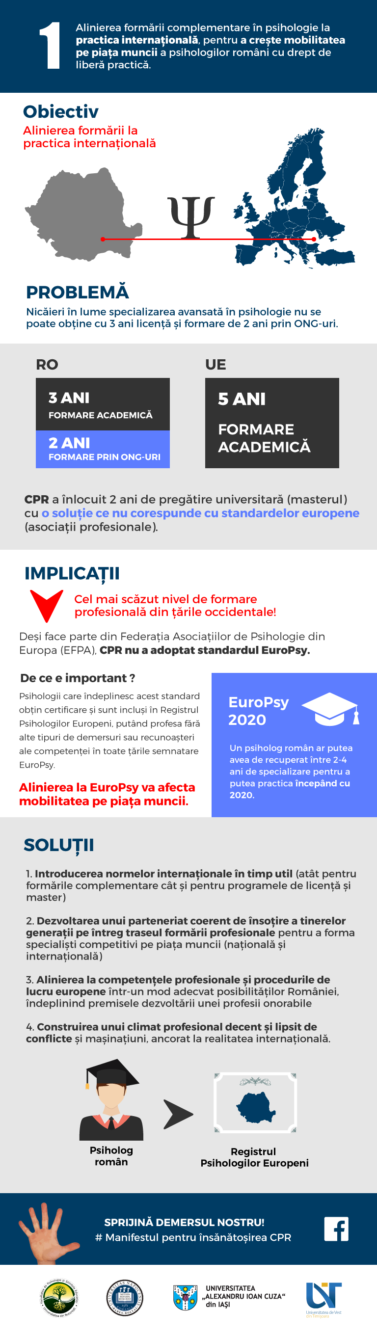 PREAMBUL: Înainte de a discuta primul punct din listă (alinierea formării la practica internațională), dorim să vă mulțumim pentru interesul arătat față de acest demers și pentru mesajele de susținere primite. În această luptă cu politica ineficientă dusă de actuala conducere din CPR avem nevoie să acționăm unitar, nu numai în prin mesaje de sprijin pe Facebook. Avem nevoie de o strategie coerentă, prin intermediul căreia să redăm prestigiul și demnitatea psihologilor, precum și de soluții pentru o bună guvernare a CPR.