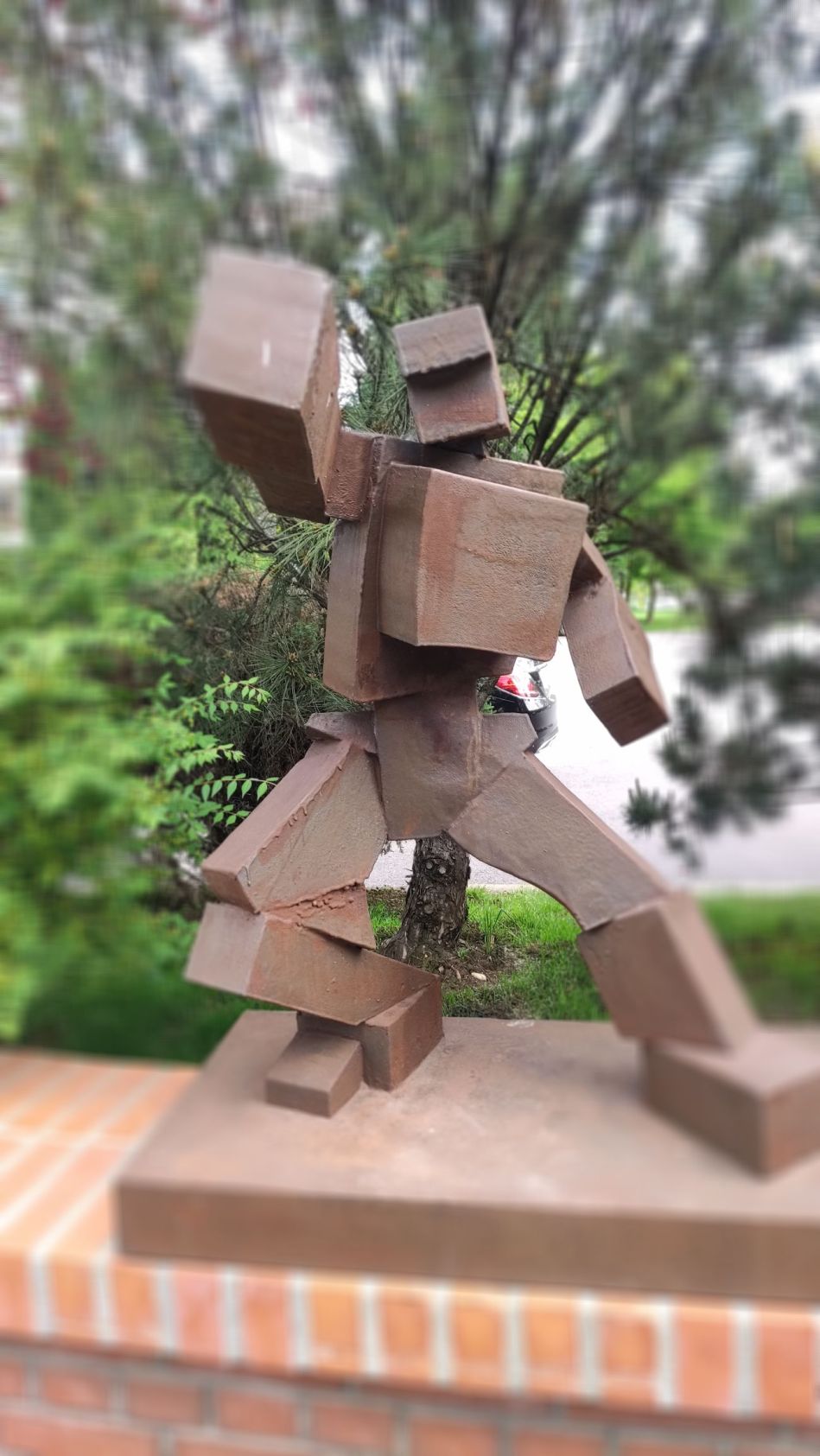 „Rebellious Forms in Space” inspirată de pozițiile eroice ale sculpturii tradiționale, îmbină influențe ale esteticii cubiste și futuriste. Forma sa fragmentată și geometrică transmite un sentiment de mișcare şi dinamism, rupându-se de reprezentarea clasică. Alegerea unor materiale ignobile, care imită fierul, contesta noțiunile tradiționale de monumentalitate conferind lucrării un caracter industrial și actual. Poli, spumă EPS, rugină, 110 x 80 x 70 cm, 2018.
