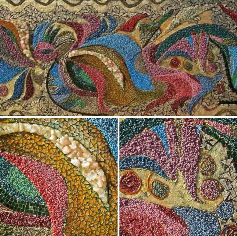 Published 7 septembrie 2025 at 1080 × 1078 in „GARDEN” 100×400 Adică lung de PATRU METRI !!! Mozaic de sticlă, plută aurie, pietricele de marmură colorată.