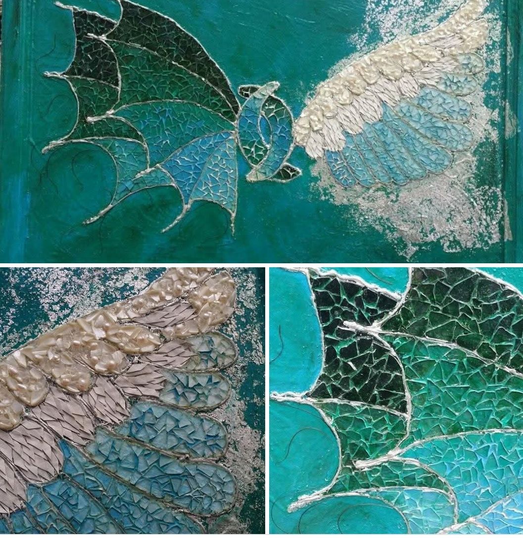 Published 7 septembrie 2025 at 1057 × 1087 in „FLIGHT AGAINST THE WINGS” 60×80 Mozaic de sticlă, perle de cultură, cristal de stâncă și piele.