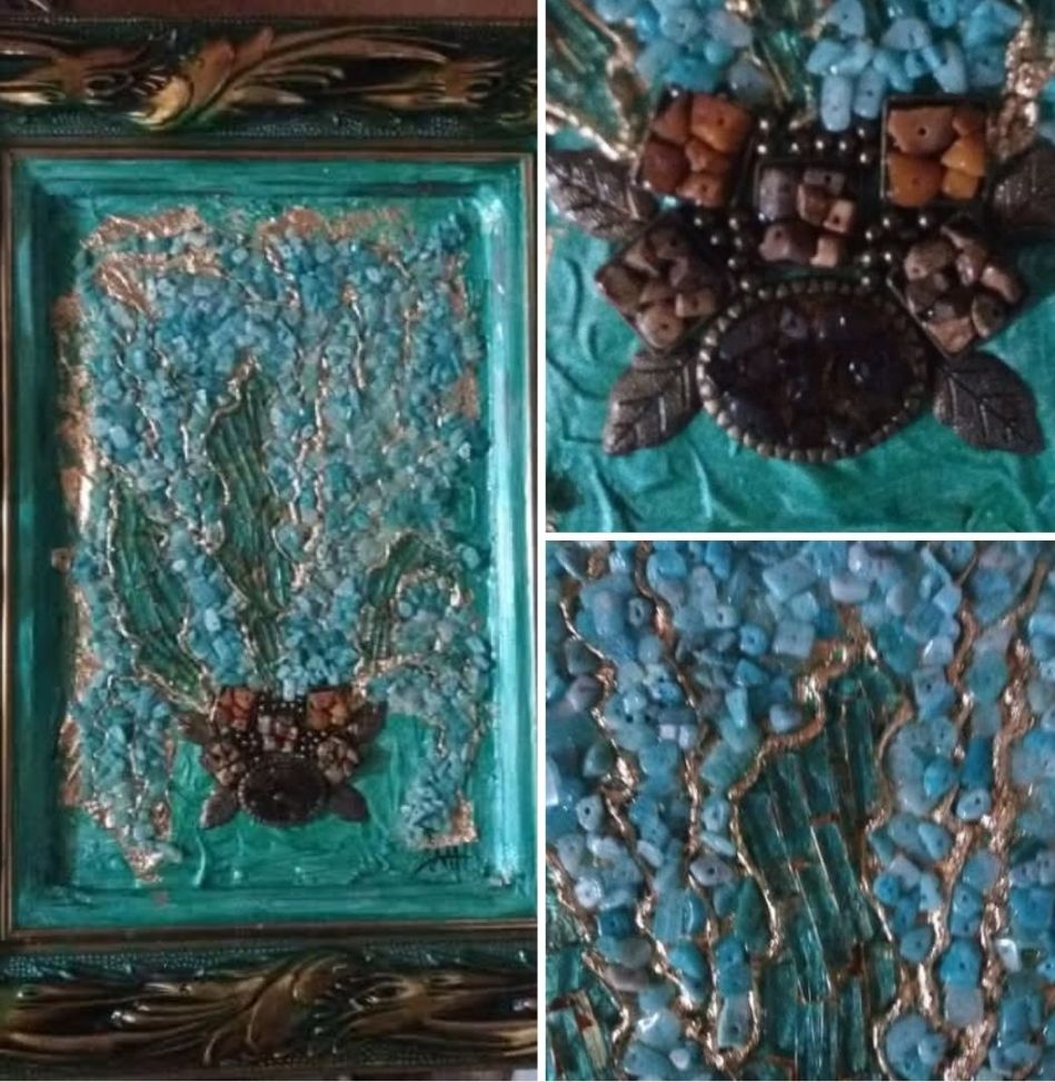 Published 7 septembrie 2025 at 1052 × 1079 in „SENIN”. 42×32 Nefrit, chihlimbar, jasp mocait. mozic de sticlă, foiță aurie și elemente de bronz patinat.