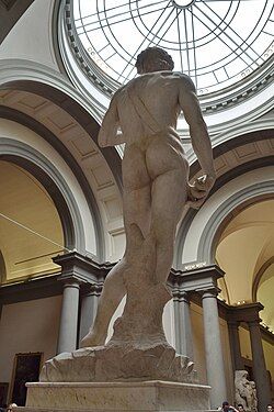 David is a masterpiece of Renaissance sculpture created in marble between 1501 and 1504 by the Italian artist Michelangelo. David is a 5.17-metre (17.0 ft)[a] marble statue of the Biblical hero David, a favoured subject in the art of Florence.??David was originally commissioned as one of a series of statues of prophets to be positioned along the roofline of the east end of Florence Cathedral, but was instead placed in a public square, outside the Palazzo Vecchio, the seat of civic government in Florence, in the Piazza della Signoria where it was unveiled on 8 September 1504. The statue was moved to the Galleria dell’Accademia, Florence, in 1873, and later replaced at the original location by a replica.??Because of the nature of the hero it represented, the statue soon came to symbolize the defence of civil liberties embodied in the Republic of Florence, an independent city-state threatened on all sides by more powerful rival states and by the hegemony of the Medici family. The eyes of David, with a warning glare, were fixated towards Rome.